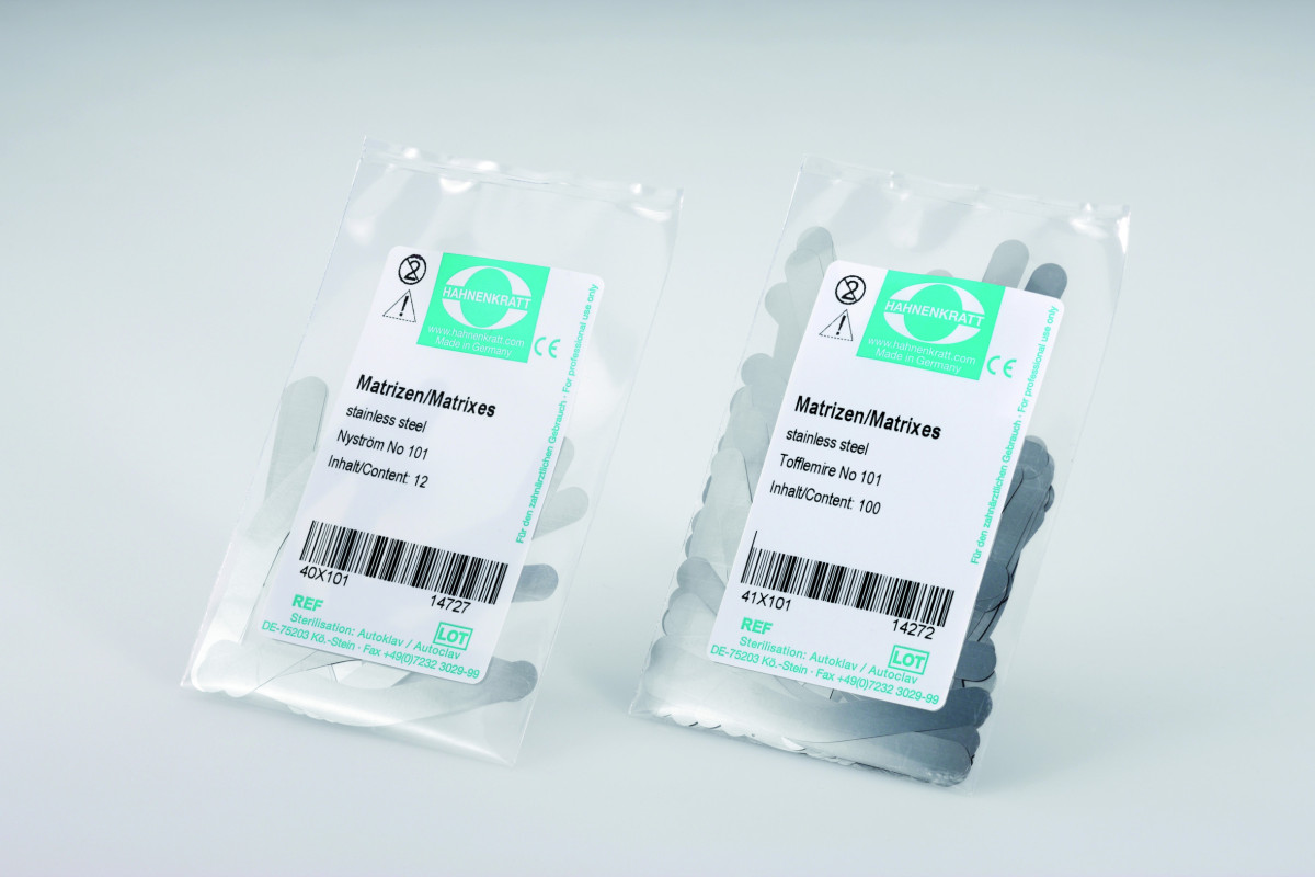 Zur Registrierung / AnmeldungHAHNENKRATT Matrizen und Matrizenbänder werden in allen Formen hergestellt. Der verwendete rostfreie Edelstahl hat eine hohe Zugfestigkeit. Die Matrizen gibt es in der Stärke 0,04 mm und in den Formen: