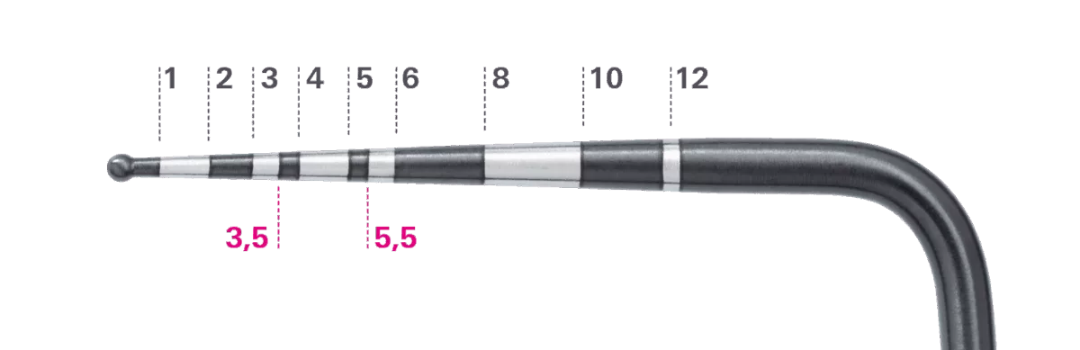 Mit der neuen Skalierung lassen sich alle Werte bestimmen, die für die Umsetzung der neuen Richtlinie – hinsichtlich der neuen Klassifikation und der Therapiestufen – notwendig sind. Sie vereinfacht die Diagnostik, parodontaler und periimplantärer Erkrankungen, gemäß der neuen Richtlinie vorzunehmen. Die beiden schmalen, schwarzen Tiefenmarkierungen dienen als Referenz für ein rasches Erkennen der PSI-Werte 3,5 und 5,5 mm.